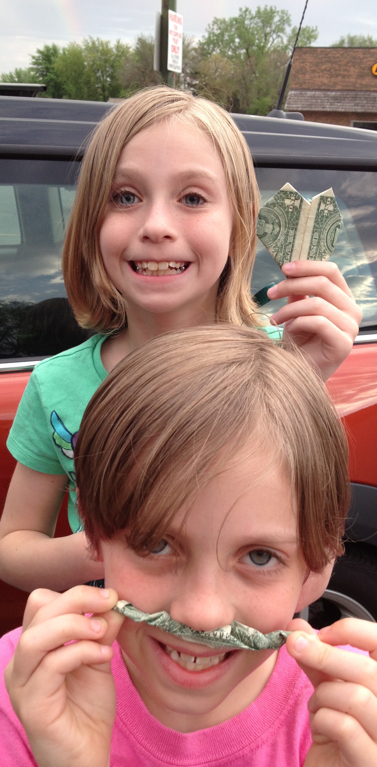 Fortunately, my daughters had a more positive approach to making something from a dollar bill. Here are their cat and mustache …