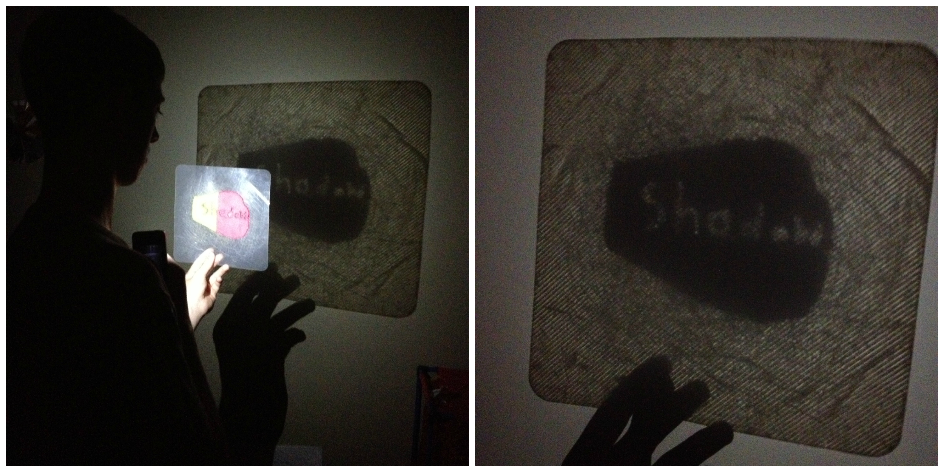 The children contributed ideas, and Isaac had a winner. So I enlisted his help. Together, we rolled out some Play-Doh (two colors, so we covered enough ground) on a clear plastic mat. Then he “carved” a word from the sheet of clay. After that, we experimented with different sources of light, and surfaces on which to project his letters. The winning combo: the flashlight app from his iPhone, projected onto the dining room wall.