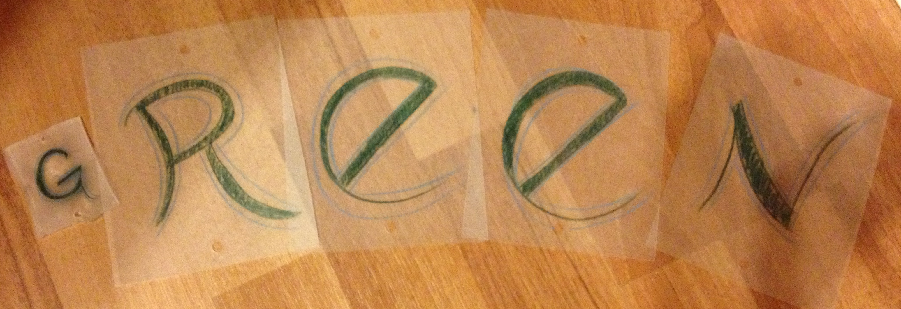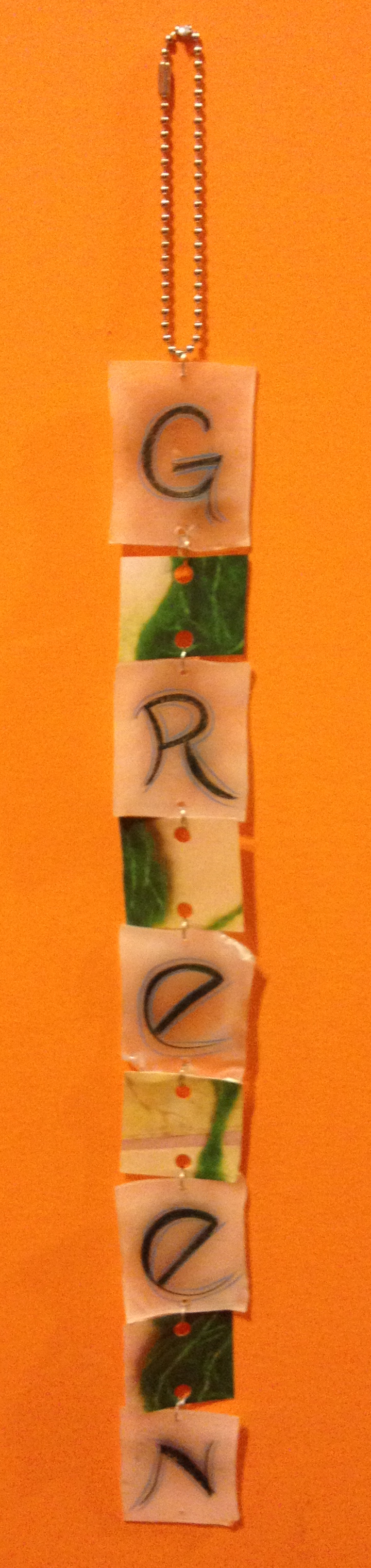 Unable to choose between this useful kit and my sister’s generous offering, I combined the two and made a hanging of sorts. I used the Shrinky Dink sheets whole, like massive mini canvases for oversized letters. This photo shows the first letter “shrunk” while the others wait for heat:
