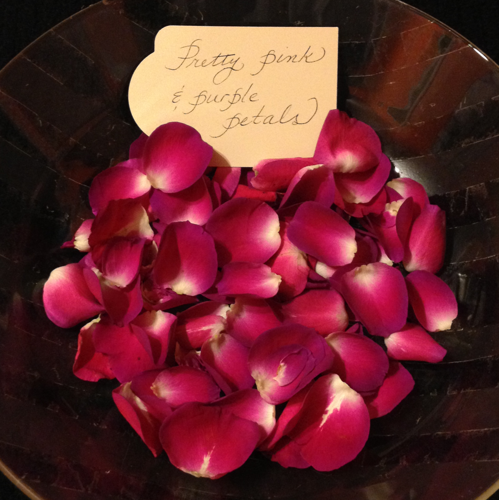 So I made a pile of pretty pink and purple petals (with a little alliteration alongside). We’ll see how long the petals match the description on the card. Updates to come …
