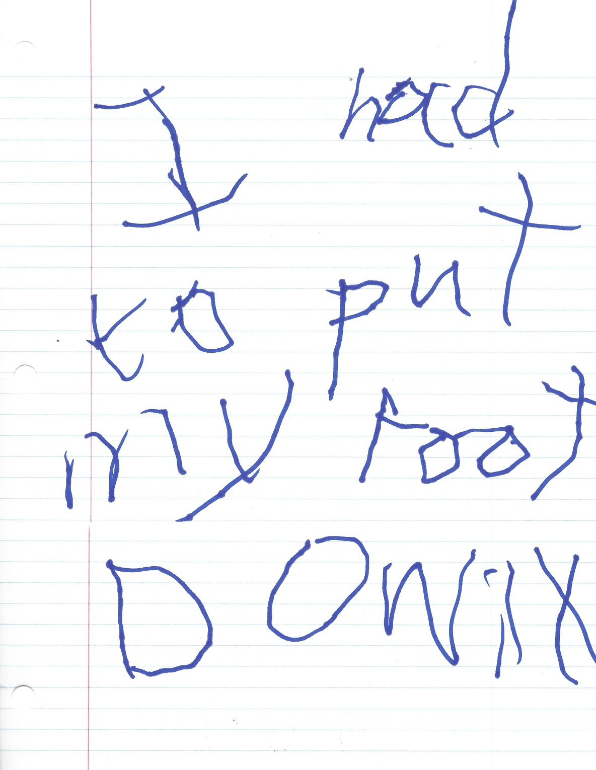 What you see below is my second attempt. The first was truly laughable. This second pass is legible right up to the last character, when I lost my grip on the page and couldn’t quite see beneath my sole to connect the lines.