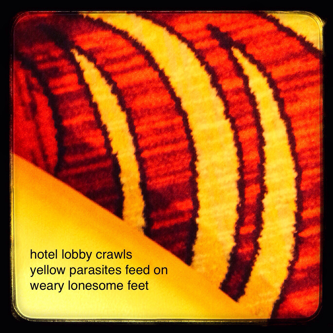 Jim and I are away for a weekend of relaxation, but I am determined to keep up with daily “making.” Today’s prompt suggested I work only with yellow, which is my least favorite color. But the hotel lobby’s decor has a healthy dose of yellow in its carpet, upholstery, and lighting. So I snapped a photo, then stared at it (and my surroundings in the hotel bar) and wrote haiku …