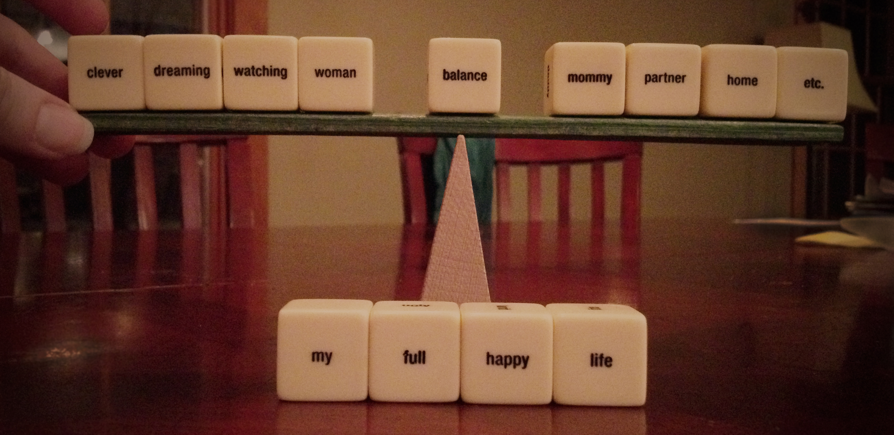 I rounded up my Haikubes and a couple wooden blocks from the kids’ toy bin. I selected and sorted words from the cube collection, grouping them to tell a story about my own daily balancing act. Then the balancing attempts began.