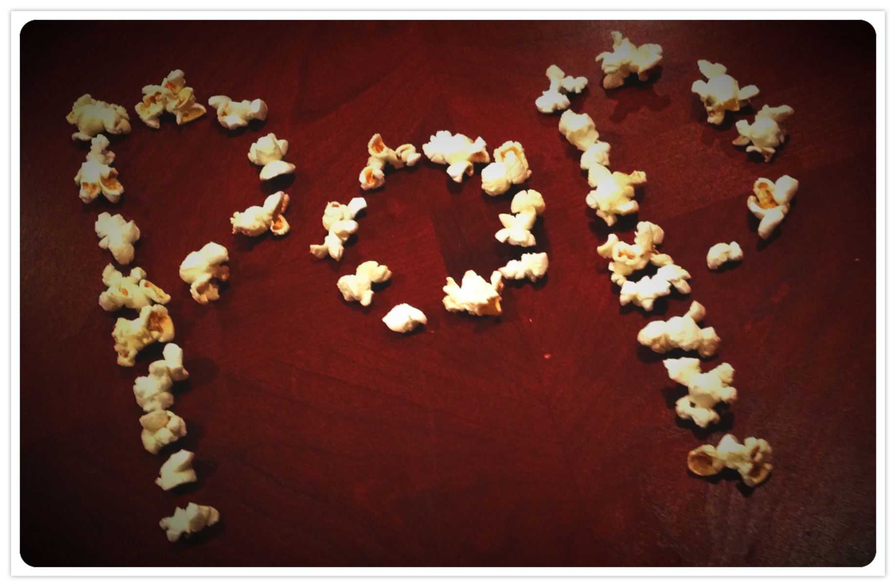 Finally, shortly before 10:00 pm, I made a big bowl of popcorn—as recommended by today’s make something prompt. To bring in my theme of “words,” I played with a few popped kernels, spelling the most obvious word on our dining room table.