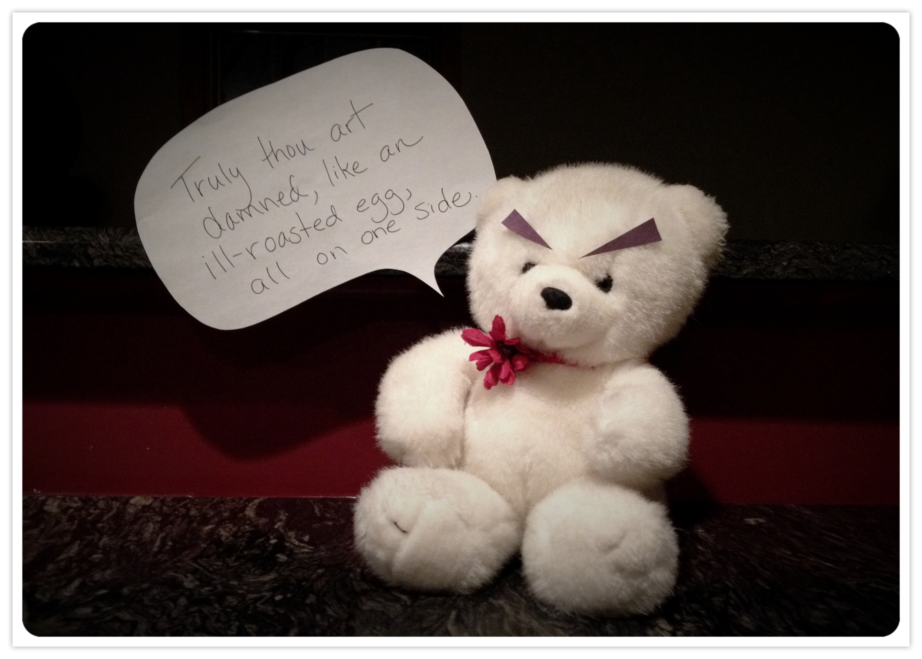 After first trying some evil eyebrows on a puppy and then a piggy, I landed on a sweet, white teddy bear. But a scowl was not enough. I needed a scathing insult to complete his dastardly conversion.