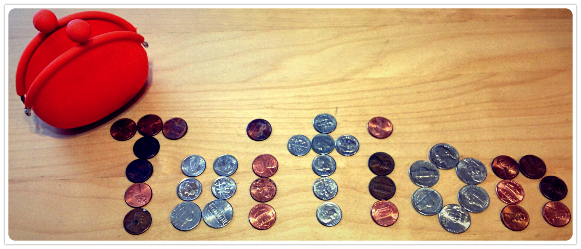 Today’s project called for pocket change. I don’t keep change in my pocket, or even in my purse. Somehow a bowlful of change has accumulated next to my bathroom sink, and there are always a few coins on top of the dryer. Otherwise, my metal money goes to an orange coin purse I keep in the car, ready for parking meters and the occasional vending machine.