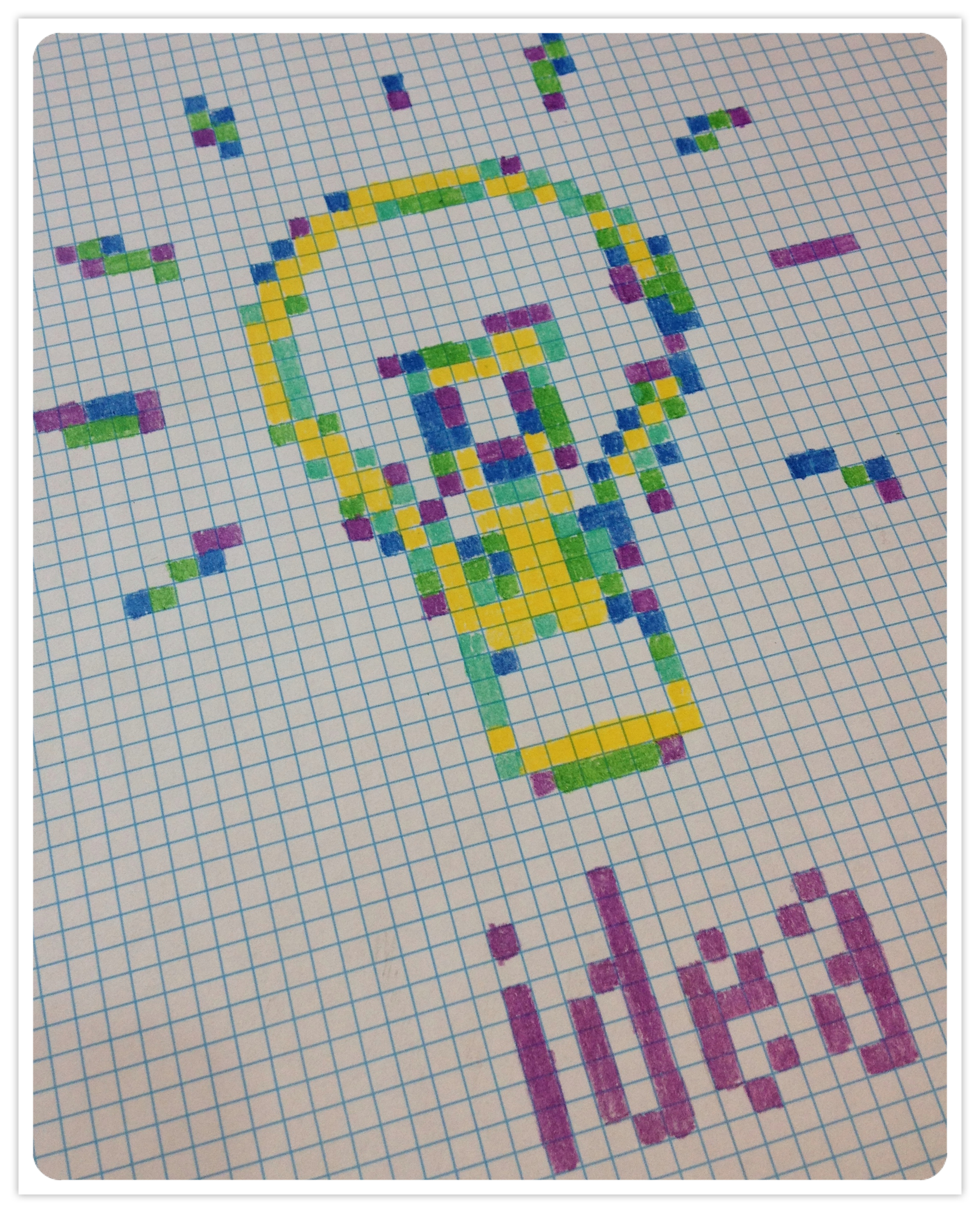 - I printed the resulting image as large as possible, then painstakingly recreated the pixelated image on blank graph paper, using several colored