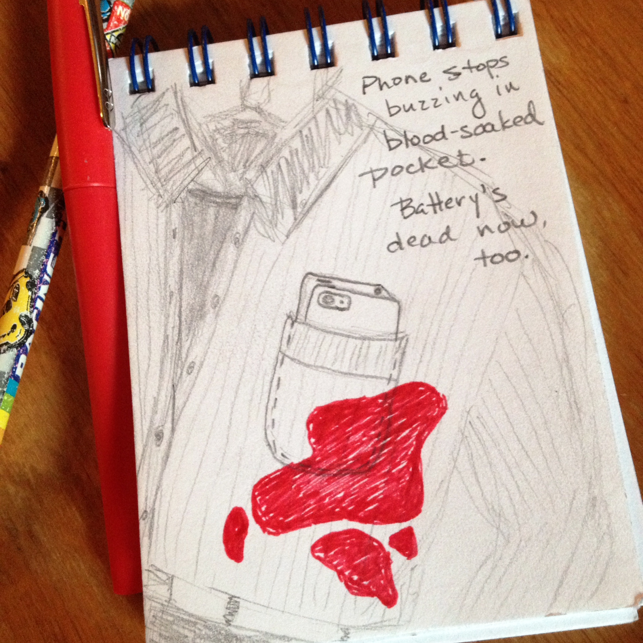 I don’t normally write fiction, much less tales of murder. I seldom sketch pictures, much less those of bloody victims. But hey, why not? This was an exceptionally fun challenge. And a unique use for my red editing pen.