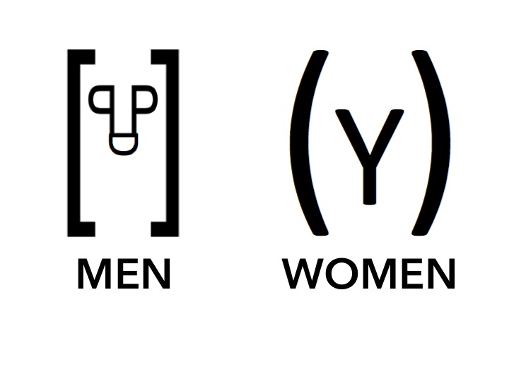As a pants-loving feminist, I don’t completely identify with the skirted person that graces so many women’s restrooms. And yet, faced with the task of inventing new icons, I see how that figure became the symbol for the ladies’ room. It is difficult to distinguish the sexes except via body parts. (Though evolving recognition of “alternate” lifestyles blurs even those lines.)