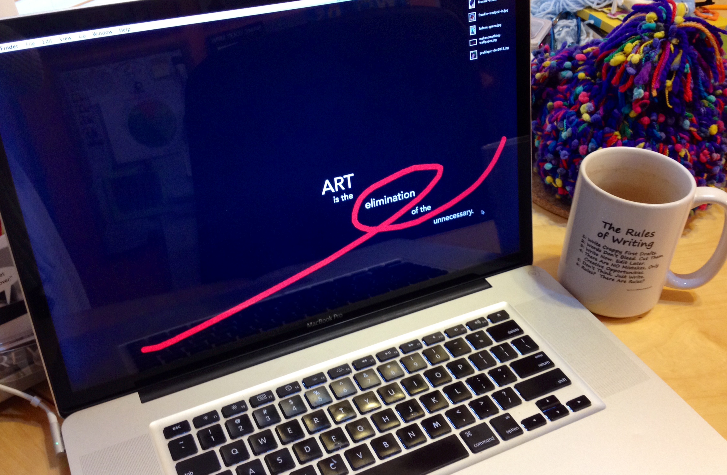 Today I blended Picasso’s words with my favorite editing mark—the generous, red swoosh of “delete”—to create a new desktop wallpaper for my laptop.