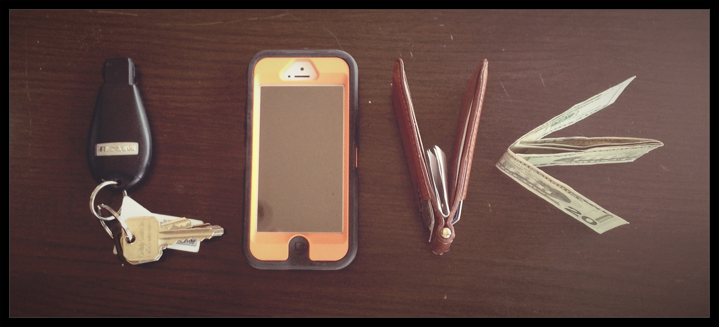 He travels light: keys, phone, money clip.
