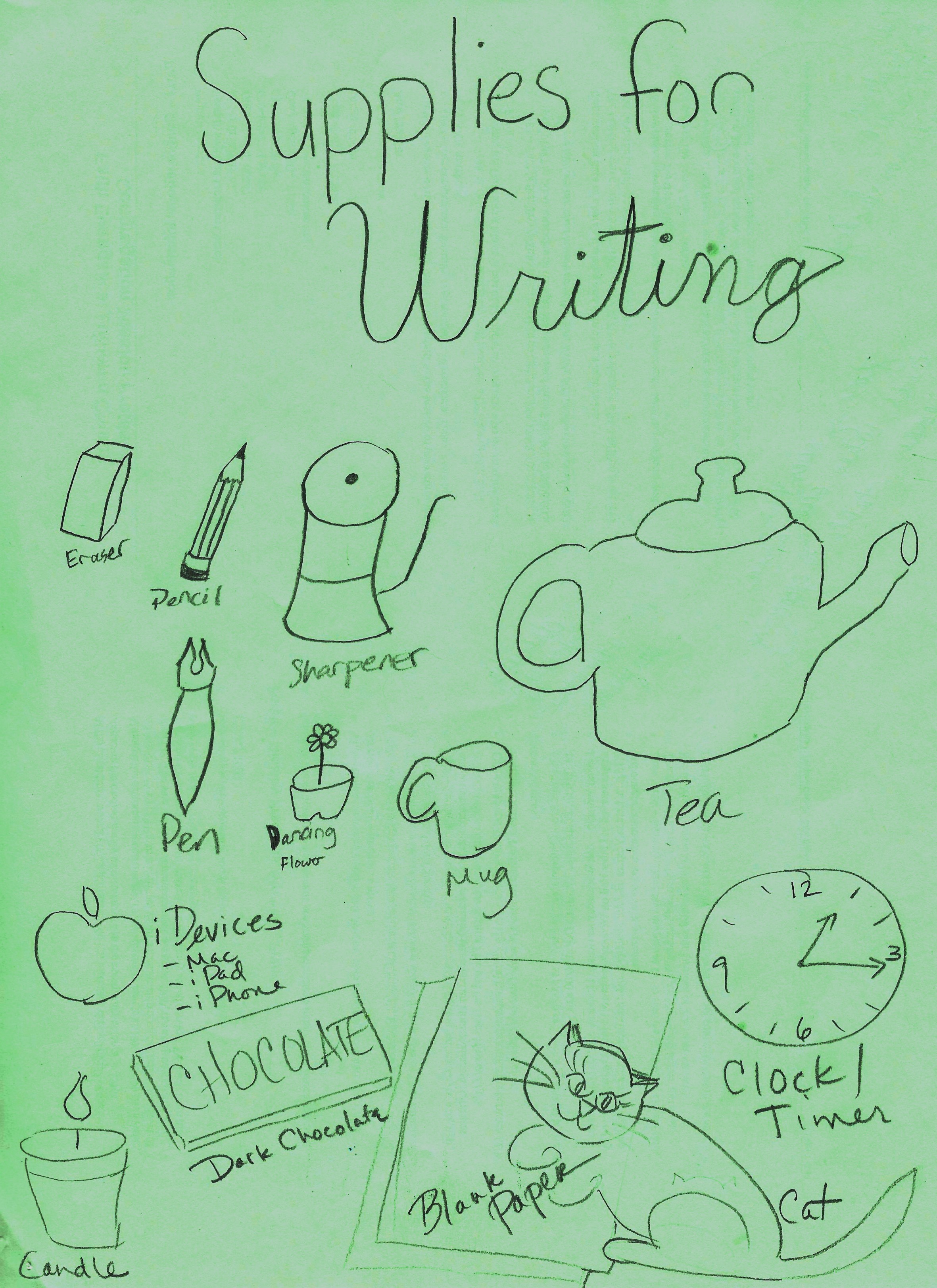 - clock/timer – because a five-minute time limit is usually all it takes to inspire an adequate first draft