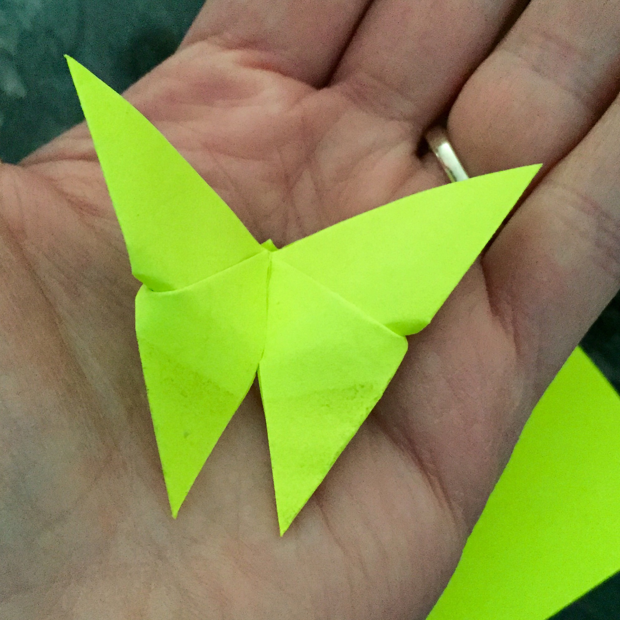 I set out to complete 30 assignments with no theme. I wanted to experience a month of spontaneous, random creativity. On day one, I made an origami butterfly from a neon sticky note. I called it Bright Flight.